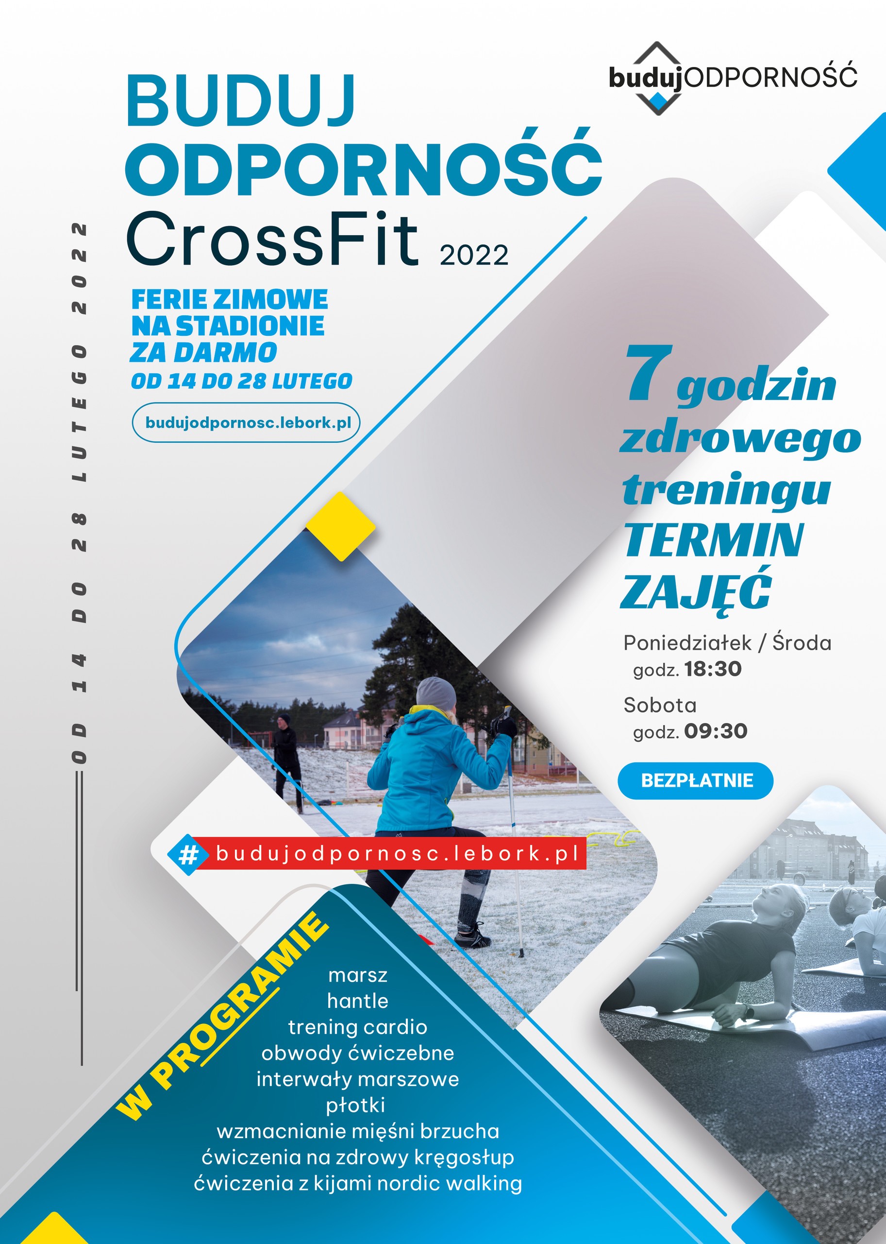 Aleksandra i Paweł MAZUR zapraszają na cykl 7 treningów ogólnorozwojowych pod nazwą CrossFit 2022, które odbędą się w dniach od 14 do 28 lutego 2022 roku na Stadionie miejskim w Lęborku. Zajęcia będą BEZPŁATNE.