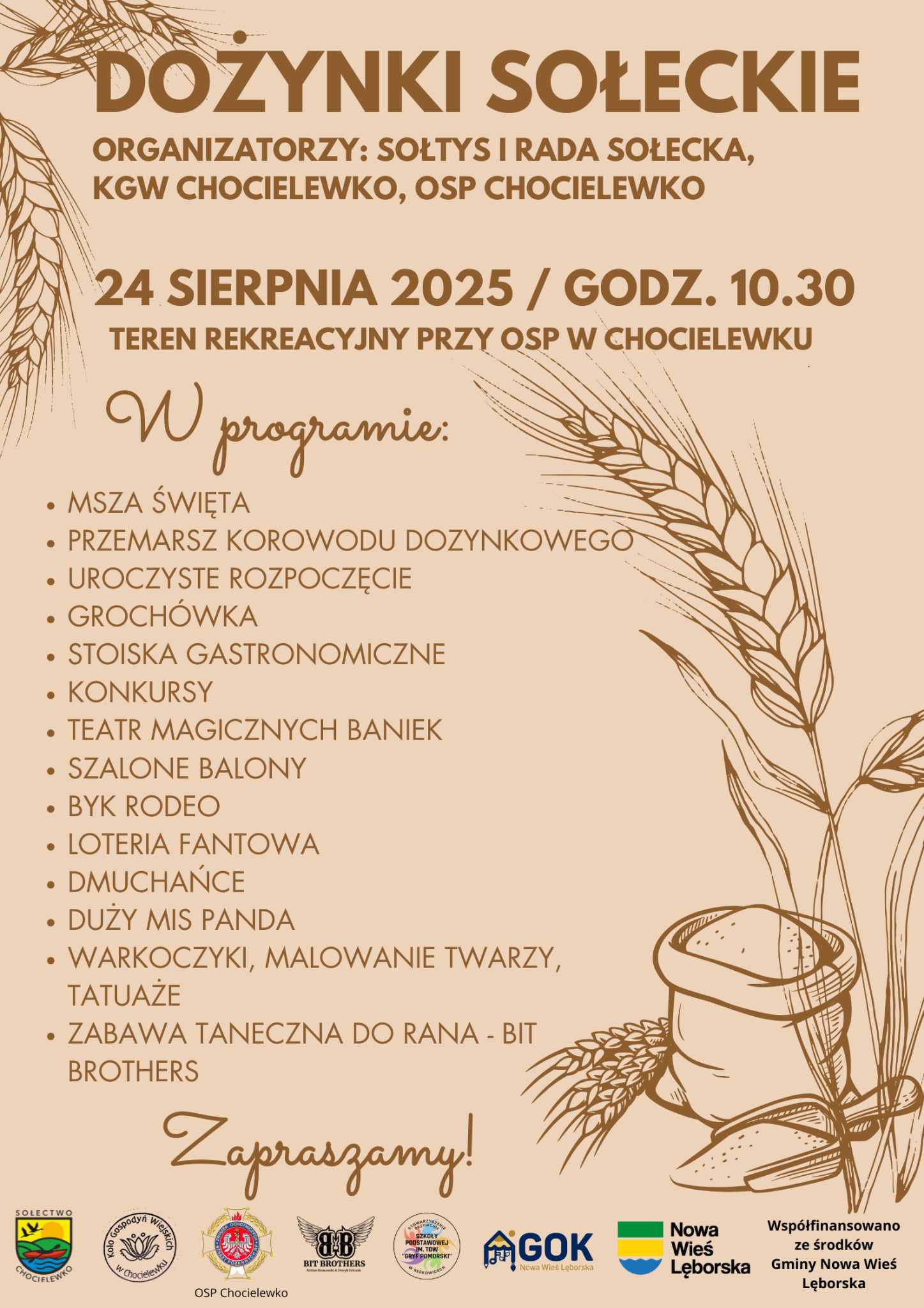 W niedzielę, 24 sierpnia 2025 roku, serdecznie zapraszamy wszystkich mieszkańców i gości na Dożynki sołeckie w Chocielewku. Impreza rozpocznie się o godzinie 10:30 na terenie rekreacyjnym przy OSP w Chocielewku.