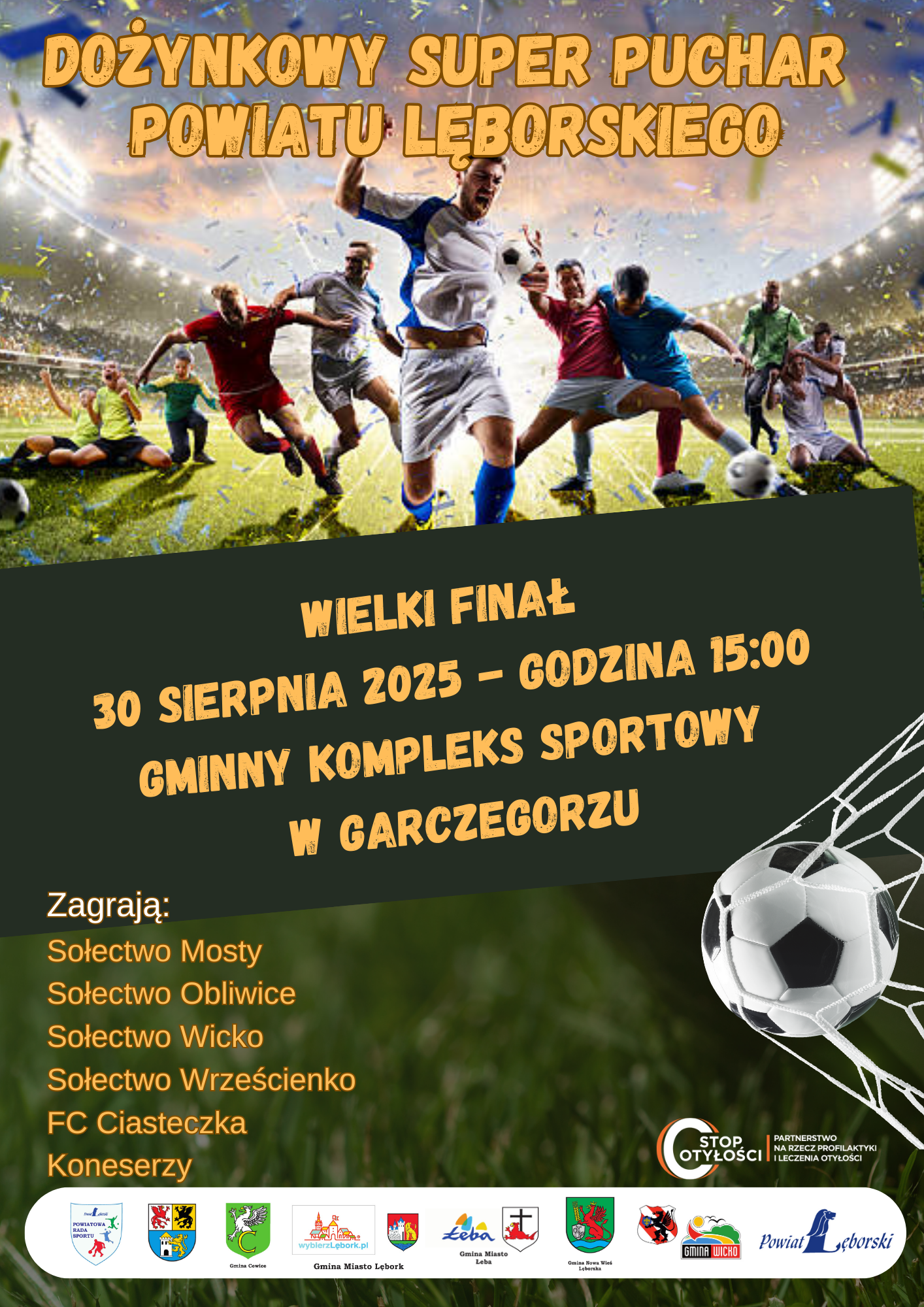 Już 30 sierpnia 2025 roku o godzinie 15:00 na terenie Gminnego Kompleksu Sportowego w Garczegorzu odbędzie się wielki finał Dożynkowego Super Pucharu Powiatu Lęborskiego. W sportowej rywalizacji o tytuł najlepszej drużyny powiatu zagrają: Sołectwo Mosty, Sołectwo Obliwice, Sołectwo Wicko, Sołectwo Wrześcienko, FC Ciasteczka oraz Koneserzy.
