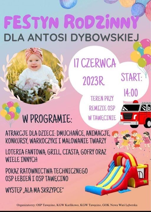 OSP Tawęcino, KGW Karlikowo, KGW Tawęcino, GOK NWL zapraszają na Festyn Rodzinny dla Antosi Dybowskiej w Tawęcinie.