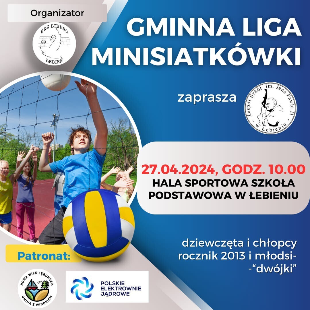 Serdecznie zapraszamy do udziału w rozgrywkach i wspólnego tworzenia sportowej atmosfery podczas Gminnej Ligi Minisiatkówki w Łebieniu 27 kwietnia od godz. 10.00.