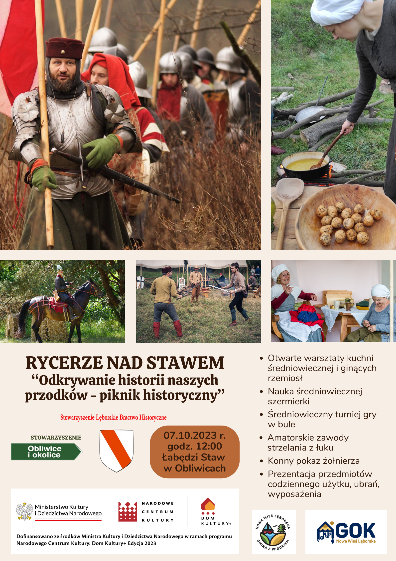 "Rycerze nad stawem. Odkrywanie historii naszych przodków — piknik historyczny" to inicjatywa o charakterze edukacyjno-rekreacyjnym. Centrum wydarzenia stanowić będzie obóz średniowieczny przygotowany przez Stowarzyszenie Lęborskie Bractwo Historyczne. Zapraszamy 7 października (sobota) od godz. 12.00 nad "Łabędzi Staw" w Obliwicach.