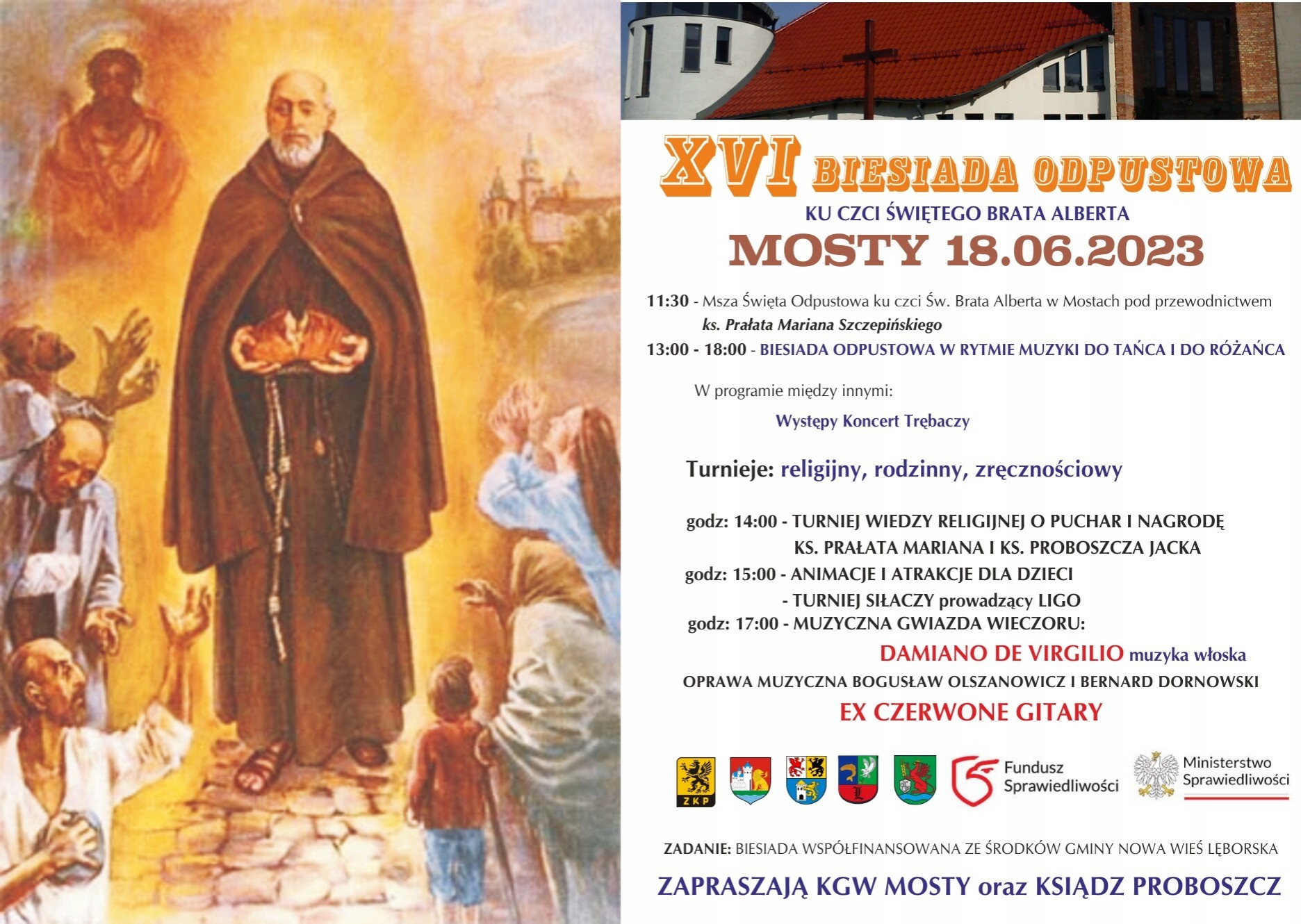 Proboszcz Parafii pw. św. Brata Alberta Chmielowskiego w Mostach i Koło Gospodyń Wiejskich Mosty zapraszają na biesiadę odpustową ku czci świętego Brata Alberta, 18 czerwca (niedziela).