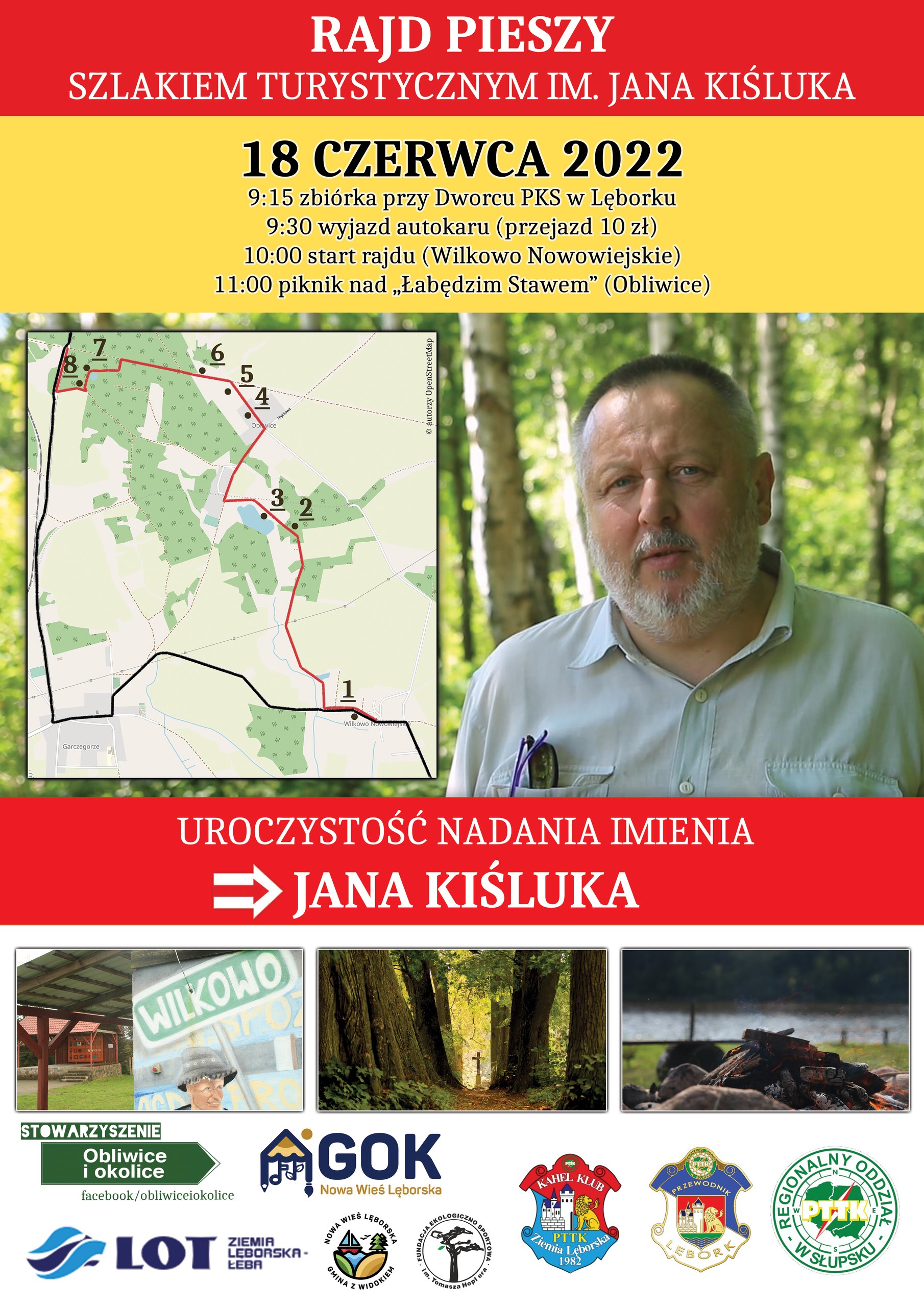 Stowarzyszenie "Obliwice i Okolice", Gminny Ośrodek Kultury w Nowej Wsi Lęborskiej, Lot Ziemia Lęborska-Łeba, Regionalny Oddział PTTK w Słupsku, PTTK KAHEL Lębork, Fundacja Ekologiczno-Sportowa im. Tomasza Hopfera zapraszają na uroczyste nadanie pieszemu czerwonemu szlakowi turystycznemu z Wilkowa Nowowiejskiego do Obliwic im. Jana Kiśluka.