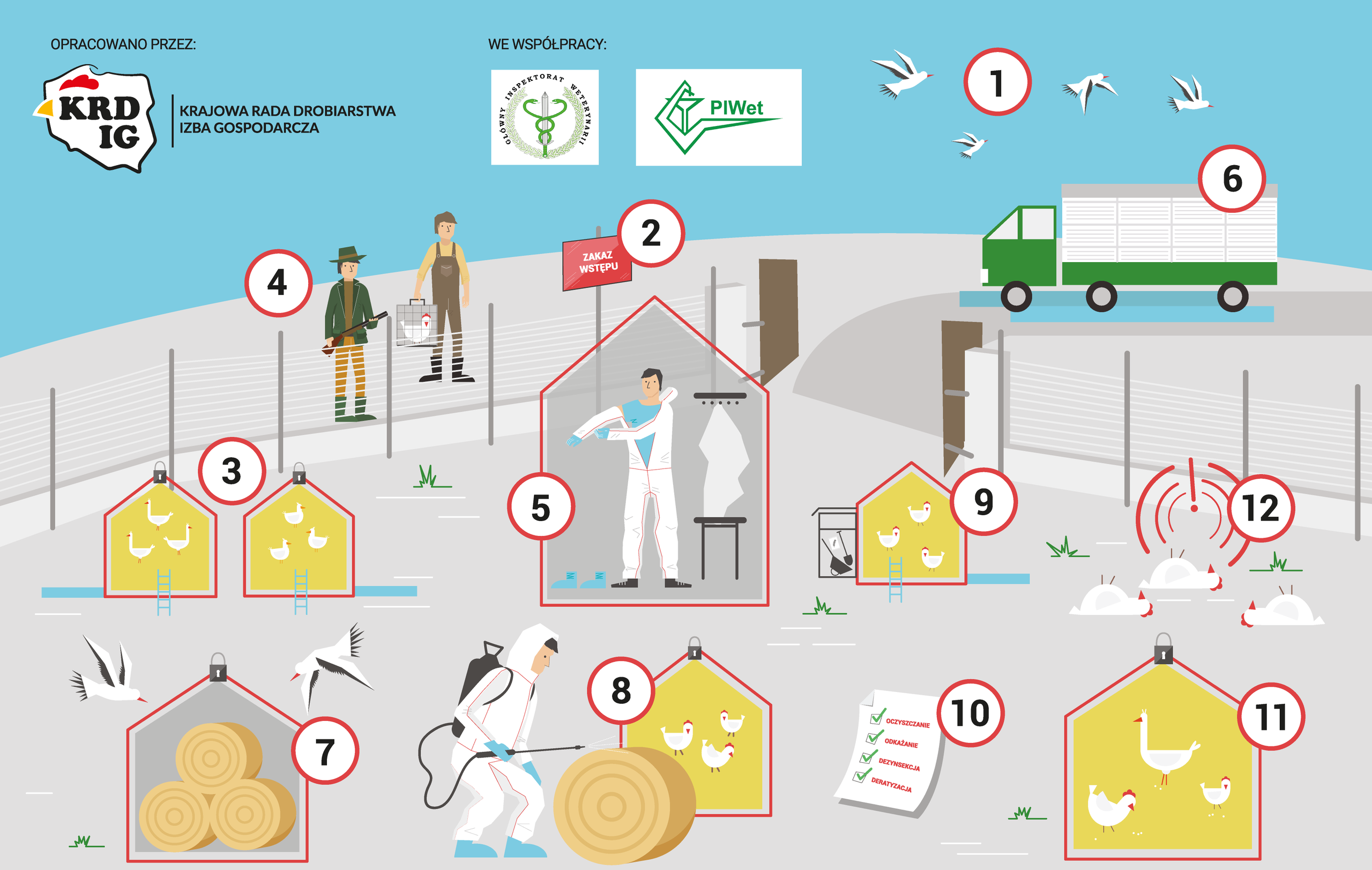 - Wprowadź zakaz wstępu na fermę osobom mającym kontakt z innym ptactwem (np. właścicielom przydomowych kurników, czy myśliwym).